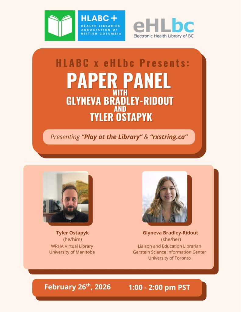HLABC and eHLbc have partnered to present a virtual paper panel featuring Glyneva Bradley-Ridout, Liaison and Education Librarian at Gerstein Science Information Center at the University of Toronto and Tyler Ostapyk, Librarian at the WRHA Virtual Library at the University of Manitoba.
